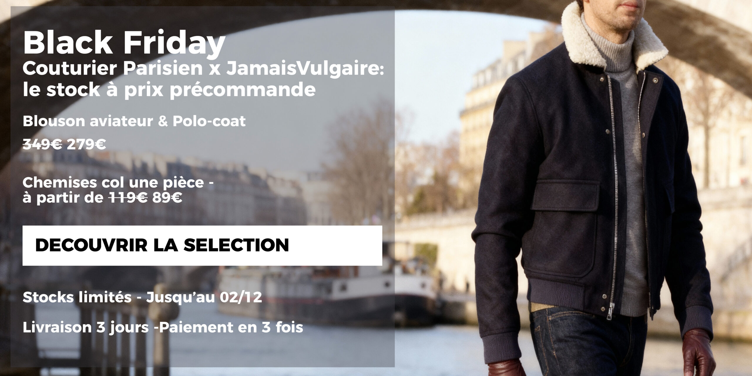 JamaisVulgaire existe depuis plus de 11 ans comme média de mode masculine : j’y partageais mes découvertes et guides, tout en regrettant parfois de ne pas trouver certaines pièces prêt-à-porter de qualité à un tarif raisonnable. Aujourd’hui, je continue à vous proposer en précommande les vêtements que j’affectionne et porte au quotidien, mais désormais conçus en collaboration exclusive avec Couturier Parisien, qui possède son propre atelier. Cette alliance nous permet de produire en petites quantités, avec un contrôle qualité maison, tout en maintenant un rapport qualité/prix imbattable.