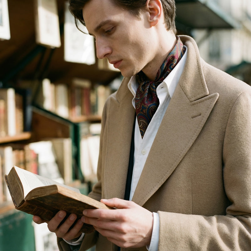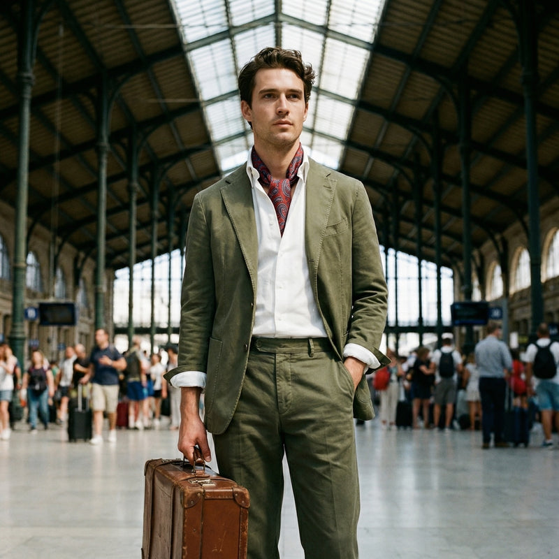 Sous un costume en coton olive porté de manière décontractée, ajoutez un foulard en soie à motifs paisley noué dans l'encolure : le contraste entre la texture granuleuse de l'oxford et la fluidité de la soie crée une tension visuelle très réussie. Pour l'été, associez-la à un costume tabac et des mocassins à pampilles — la chemise seule suffit à structurer la tenue.