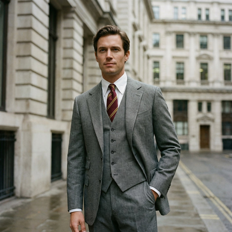Son ouverture modérée accueille parfaitement un nœud de cravate four-in-hand légèrement asymétrique ou un double Windsor plus structuré. Avec un costume trois pièces en Prince de Galles gris, associez-le à une cravate club bordeaux et or : le contraste entre la sobriété de la chemise blanche et le motif affirmé de la cravate crée un ensemble d'une grande prestance.