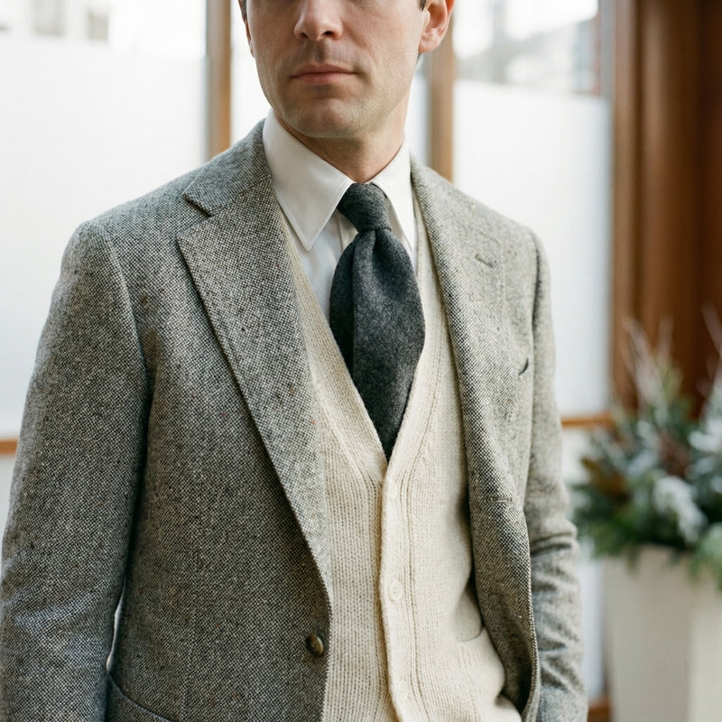 En mi-saison, glissez un cardigan col V sous une veste sport en tweed donegal : le col français dépasse juste ce qu'il faut pour apporter du relief sans surcharger. L'oxford texturé dialogue naturellement avec les matières brutes.