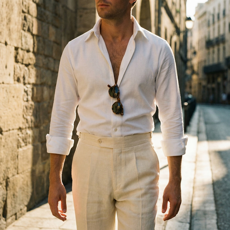 C'est précisément dans ce registre décontracté que notre col français révèle tout son potentiel. Grâce à sa patte de boutonnage invisible, il conserve une tenue impeccable même porté ouvert sur deux boutons — là où d'autres cols s'affaissent et perdent leur structure.