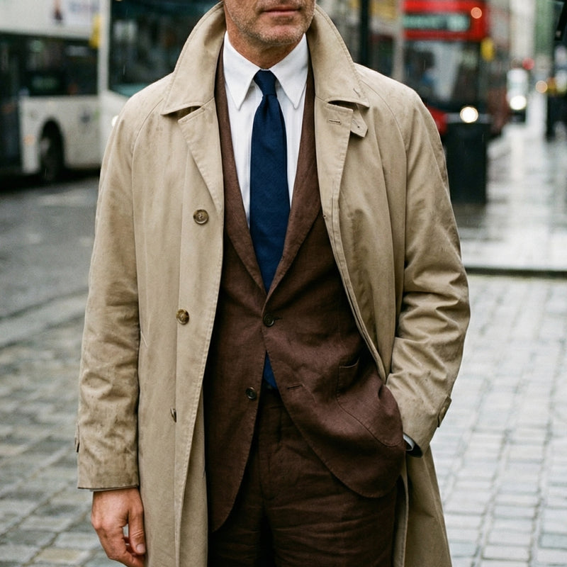 Enfin, sous un costume tabac rehaussé d'un trench beige, une simple cravate bleu marine en grenadine suffit. La longueur des pointes du col assure un maintien impeccable tout au long de la journée, même après plusieurs heures de port.
