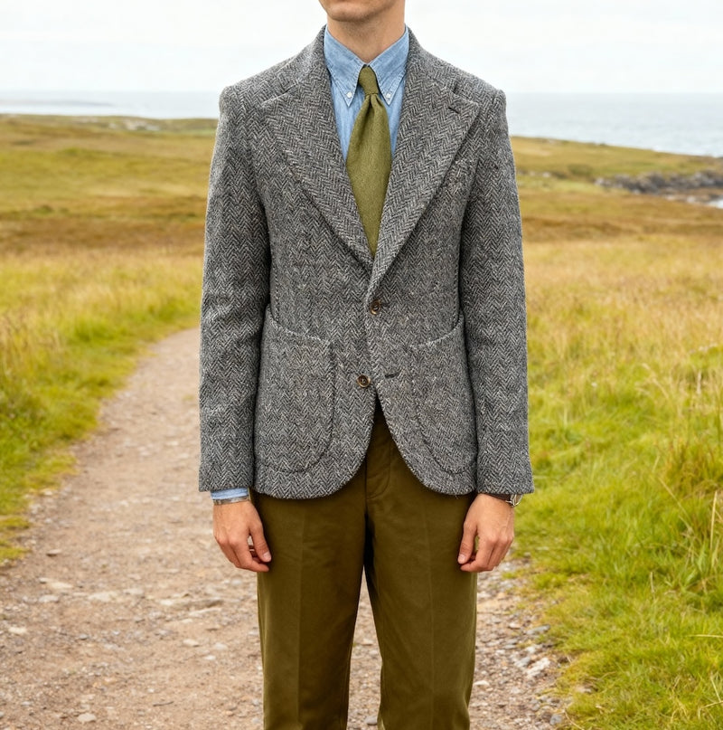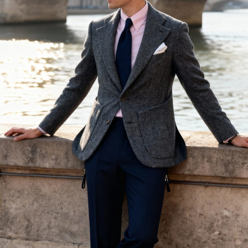 Matière: un tweed bleu chiné Prince de Galles 420g/m2 de chez Nona Source
