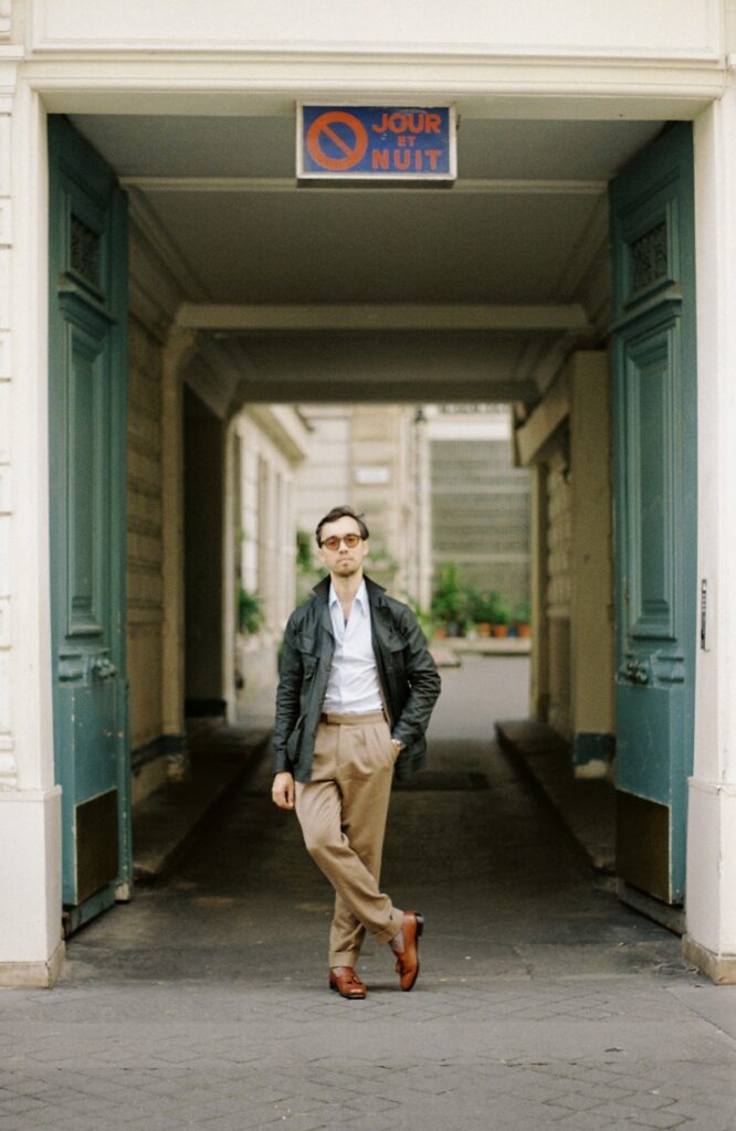 Les pointes généreuses créent un contraste saisissant avec l’aspect fonctionnel de la veste : elles humanisent et adoucissent la rigidité militaire, introduisant une élégance discrète mais perceptible. Cette longueur supplémentaire évite l’effet “chemise de travail” que pourrait suggérer l’association avec la field jacket.