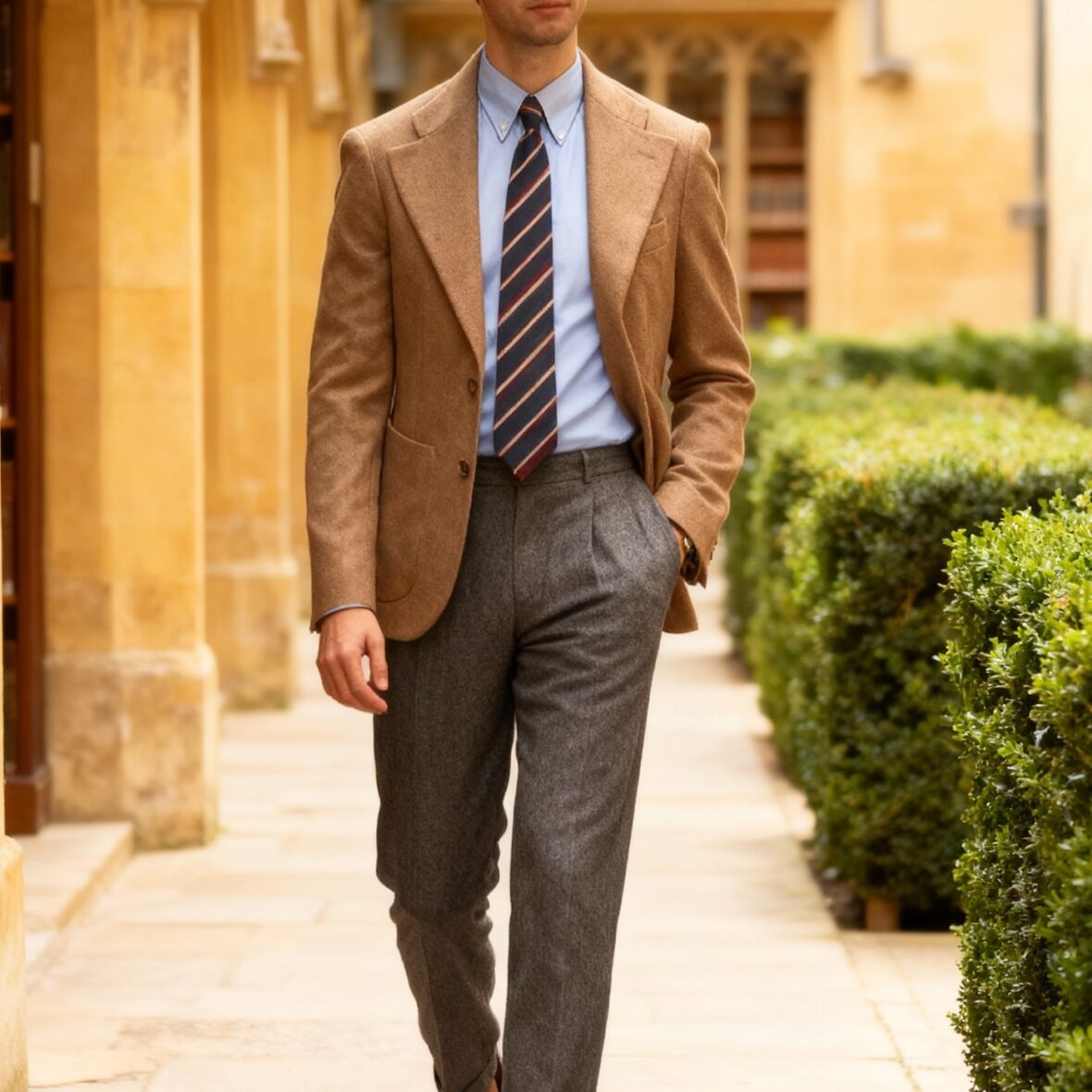 Pantalon en flanelle anthracite sous la veste camel pour affiner la silhouette. La cravate rayée relie chemise et veste et recentre le regard. Ensemble efficace du matin au soir.