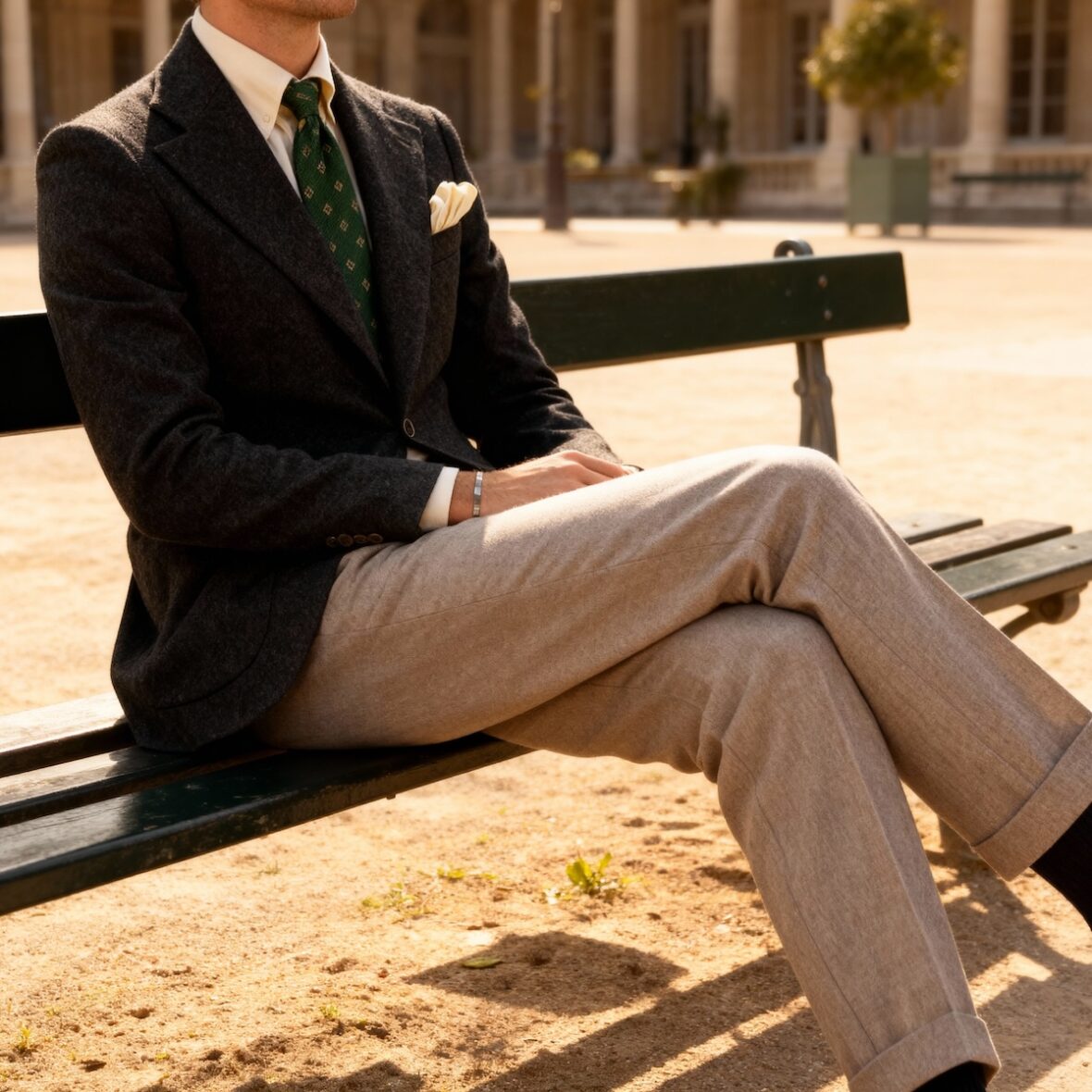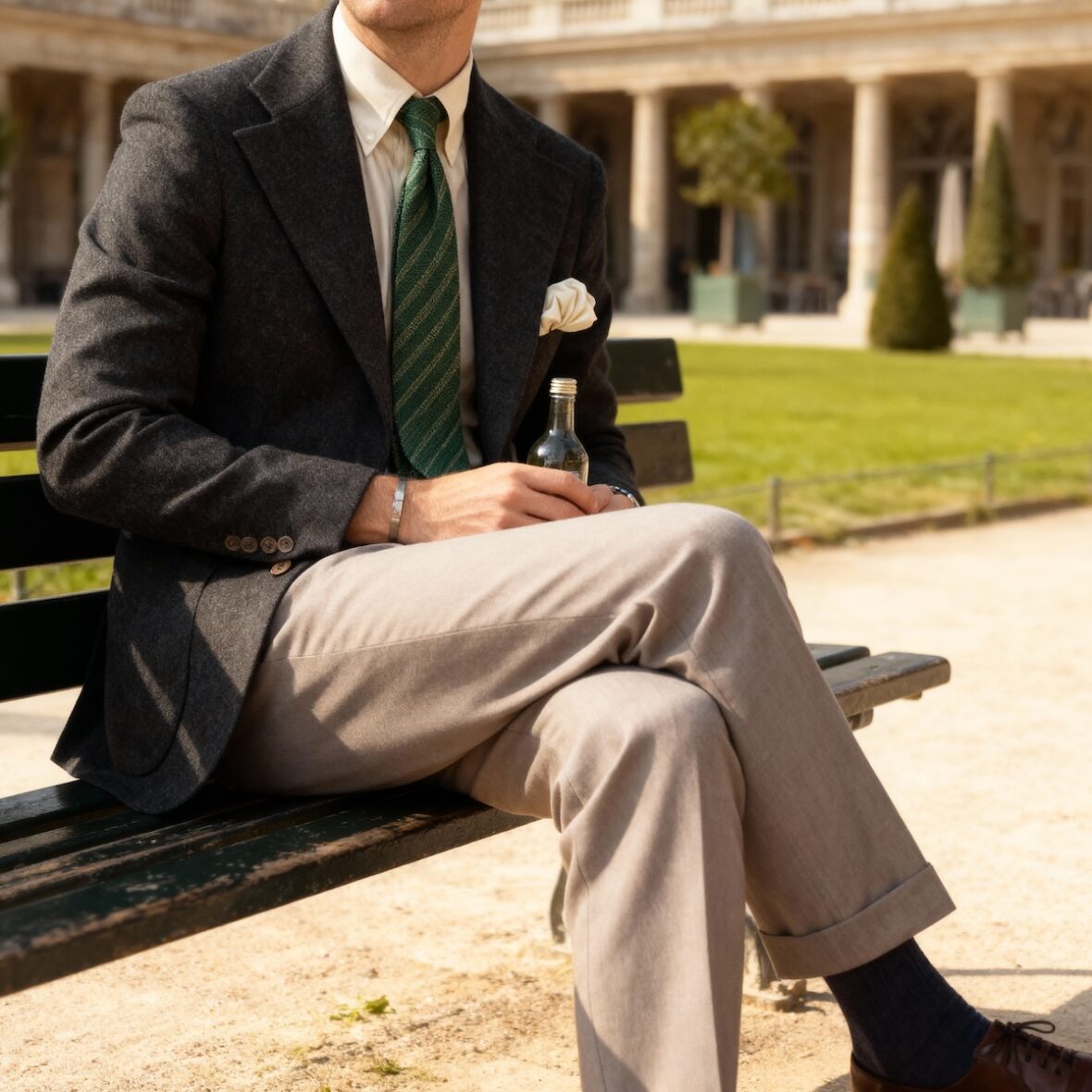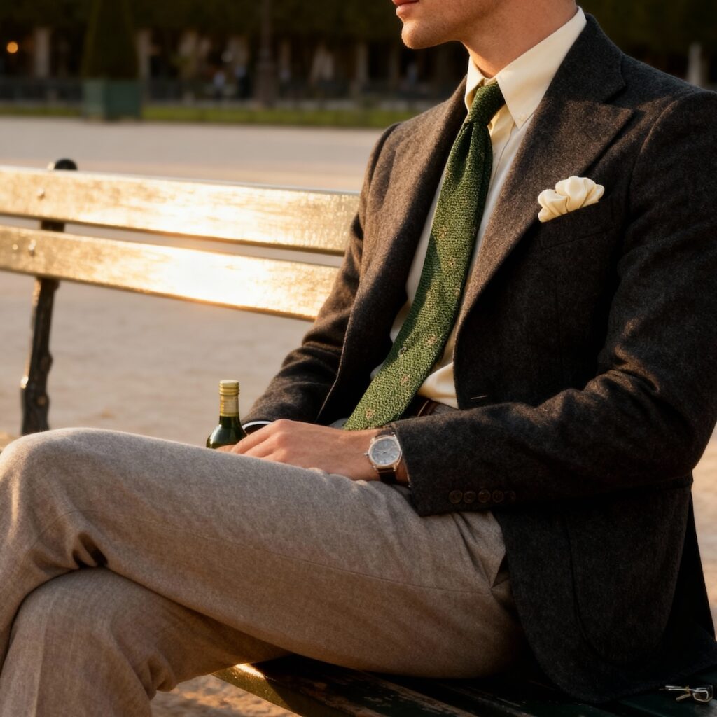 Le mannequin porte une veste en flanelle de laine vert forêt. Haut : chemise bleue et cravate brune à larges rayures sombres, pochette blanche. Bas : pantalon gris anthracite, ligne droite. Chaussures hors cadre. Le contraste froid/froid (bleu/vert/gris) et l’opposition flanelle brossée / soie texturée recentrent la veste. La verticalité provient des rayures de cravate et de la jambe nette. L’ensemble tient par une palette sourde et des volumes propres.