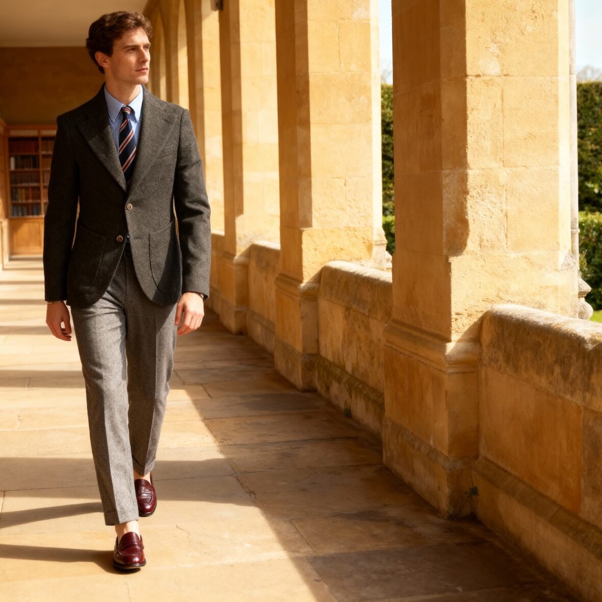 Le mannequin porte une veste en flanelle de laine vert forêt. Haut : chemise bleue et cravate club rayée bordeaux-marine. Bas : pantalon en flanelle gris moyen, coupe droite. Chaussures : mocassins bordeaux brillants modérés. Le contraste froid/froid (bleu/vert/gris) et la différence de grains entre oxford, flanelle et cuir lisse recentrent l’œil sur la veste. La verticalité vient des rayures de cravate et de la jambe propre. L’harmonie tient aux rappels sombres entre veste et chaussures.